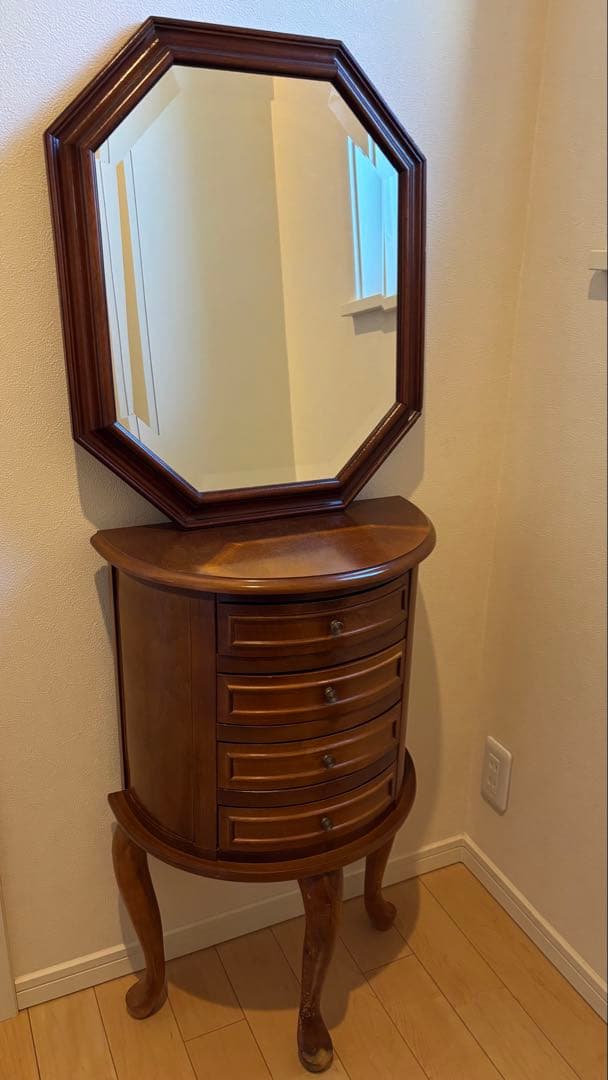 優雅な曲線を描く猫脚がとっても素敵な、アンティーク調のコンソールデスクです♪\r落ち着いたブラウンカラーにお洒落な彫刻や取っ手が映えて、置くだけでお部屋がクラシックで上品な雰囲気になります♪\r\rサイドがカゴメ編み(ラタン)のデザインになっているのがとっても珍しくて、こだわりを感じるポイントです!中央には引き出しが4段も付いているので、メイク道具や文房具、大切な小物などをたっぷり可愛く整理できちゃいます♪動きもスムーズです!\r\rサイズ\r横幅 約68cm\r奥行 約34cm\r高さ 約69.5cm\r\rコンパクトなので、リビングの片隅や寝室のサイドテーブルとしてもぴったりな大きさです!天板の上にお気に入りのミラーやランプを飾れば、自分だけの特別なスペースの完成です♪\r\r長年使用してきたアンティーク調の家具のため、天板にクラックがあり、木のアクが黒く出ている部分があります。レースなどを敷いて使用していただけると、気にならないかと思います♪\rその他、擦れや小傷、小さな塗装の剥げなどはありますが、古いものならではの深みや味わいとして楽しんでいただける方にお譲りできれば嬉しいです!\r\r配送は「たのメル便」を利用しますので、プロが丁寧にお部屋の中まで運んで設置してくれます!\r毎日の生活をちょっと優雅にしてくれる素敵な家具、ぜひお迎えください♪よろしくお願いします♪\r\r※新品の商品ではないため、写真に写りきらないキズなどある場合があります。色なども、なるべく同じように撮影をしておりますが、ご覧いただく環境により、違って見える場合がございます。\rUSED品にご理解いただきご購入ください。\r不明な点がありましたら、ご購入前にお気軽にお問い合わせください♪\r\r#猫脚 #猫足 #コンソールテーブル #サイドチェスト #アンティーク調 #ヴィンテージ家具 #レトロ家具 #ラタン #籐 #カゴメ編み #フレンチカントリー #クラシックインテリア #英国調 #サイドテーブル #ミニデスク #ドレッサー #収納家具 #古道具 #輸入家具 #イタリア家具 #サルタレッリ #タロッコ #マルニ #maruni #カリモク #karimoku #飛騨産業 #キツツキ #大塚家具 #三越ブルージュ #オールドメゾン #ドレクセルヘリテイジ #ローラアシュレイ| カテゴリー: | 家具・インテリア>>>リビング収納>>>キャビネット・サイドボード |